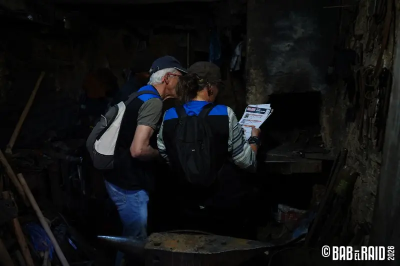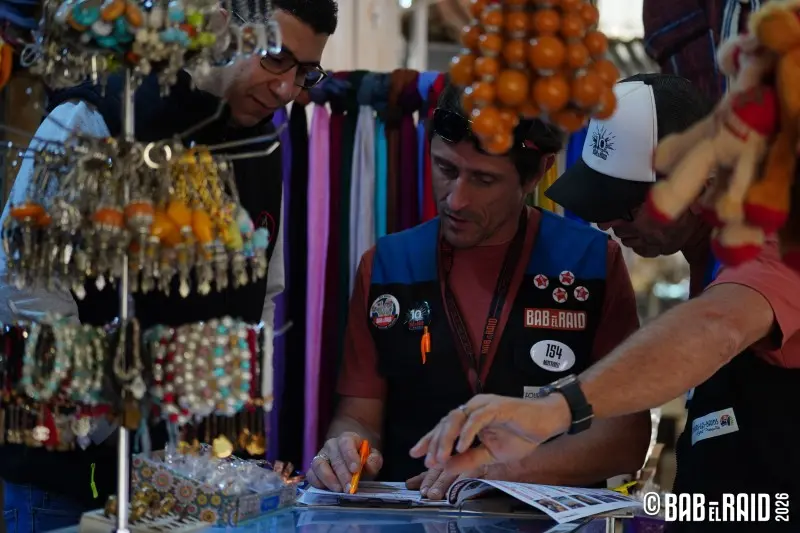 Les participants ont 30 minutes pour répondre à une vingtaine de questions et trouver des poinçons disséminés aux quatre coins du souk. Le questionnaire incite également les équipages à aller à la rencontre des commerçants pour un véritable moment de partage. Thierry, de la team 164 , ancien mineur qui a longtemps travaillé avec des Marocains entame facilement la conversation, ce qui l’aide à répondre aux questions.