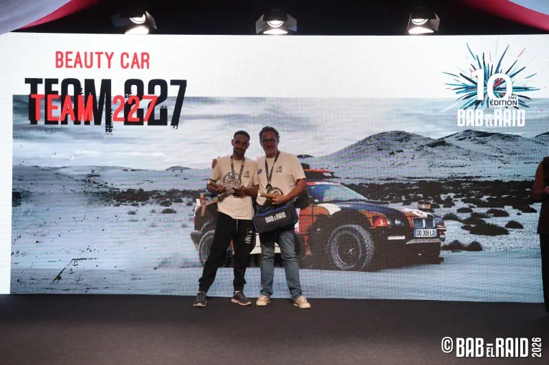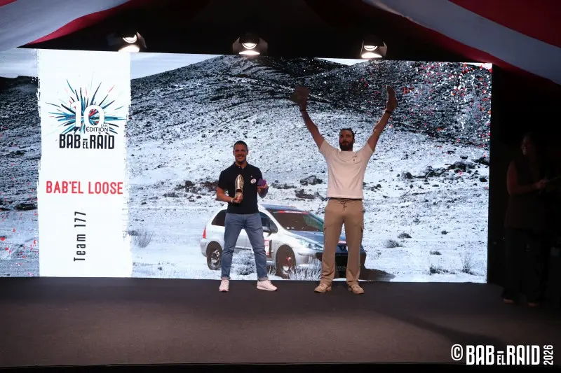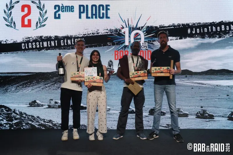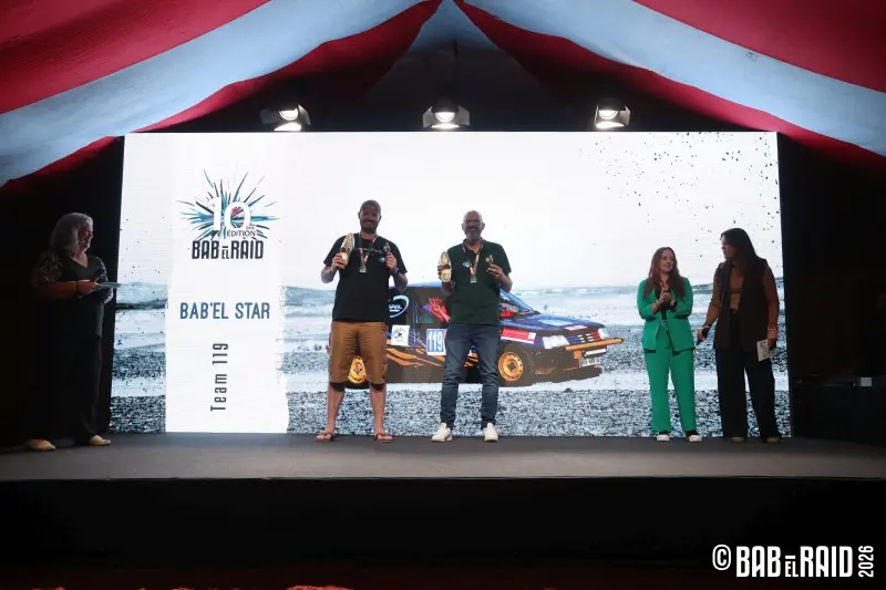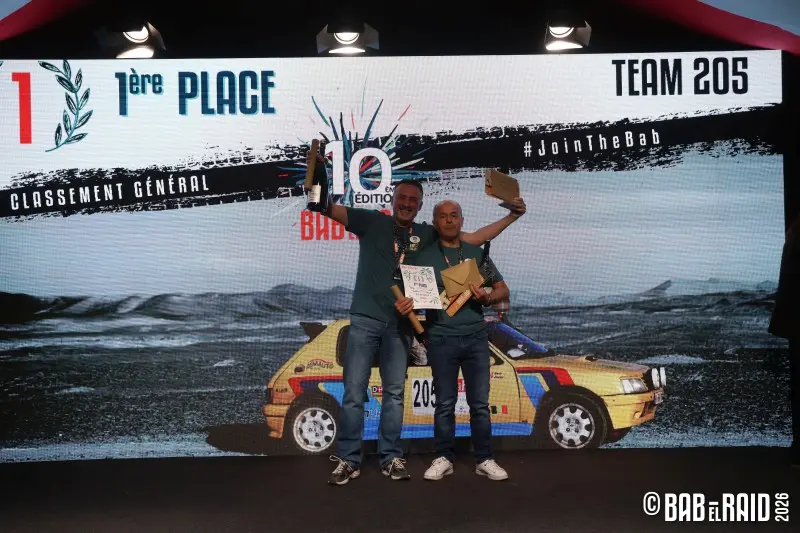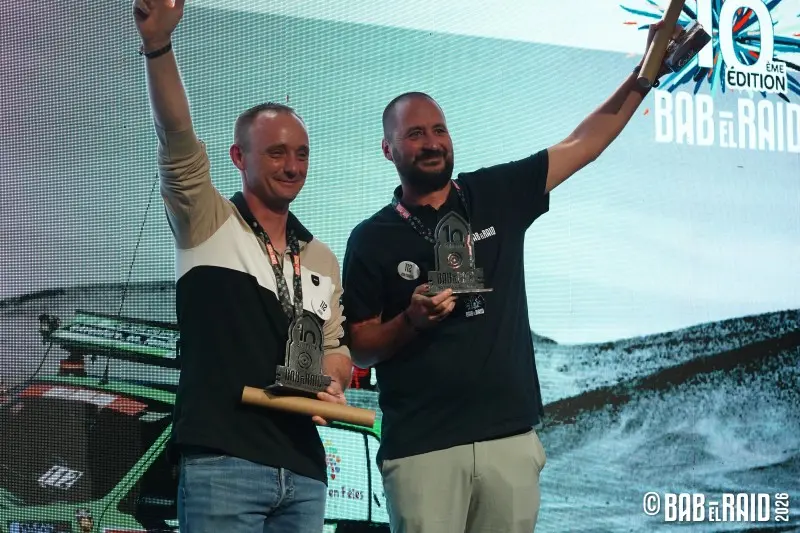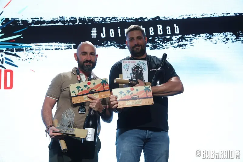 Pour cette soirée, tous les équipages ont leur moment de gloire et montent sur scène pour recevoir une médaille. Ensuite, ce sont les podiums qui sont appelés. Au classement général de cette 10e édition, c’est l’équipage 205 , formé par Javier et Emin, qui termine à la première place. Après deux participations, c’était l’objectif des deux participants qui ont donc réussi à l’atteindre cette année et ne cachaient pas leur joie au moment de monter sur scène. « Le Bab ça ressemble à Koh Lanta, c’est à la fois pas facile et en même temps une aventure humaine incroyable », souligne Javier. Emin, lui, adresse une mention spéciale à tous les copilotes ! Pour la première fois dans l’histoire du Bab el Raid, deux équipages terminent ex æquo à la deuxième place : Isabelle et Fabien 168 ainsi que Morris et Pierrick 198 . Yannick et Fabien, de l’équipage 150 , complètent le podium à la troisième position.